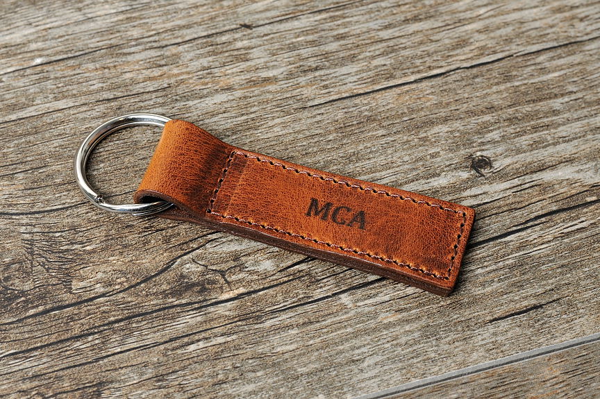 Our Key Chain made from Horween Dublin leather will age well and develop a rich patina over time. Shown here in three colors: Roasted Maple (lightest), Roasted Chestnut (medium, shown with optional monogramming) and Roasted Walnut (darkest).